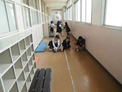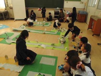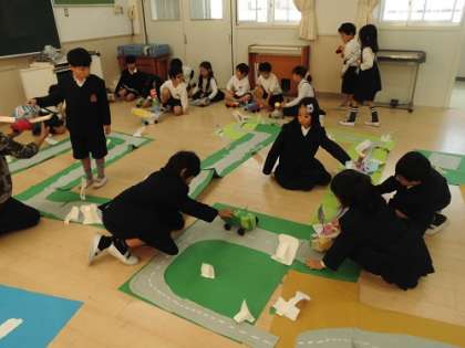 生活科の「うごくおもちゃを作ろう」の学習で、身の回りにあるものを利用して車を作りました。形や飾り付けを工夫して世界に一つのマイカーが出来上がりました。特設コースを作って走らせたり、廊下で競争したりしました。