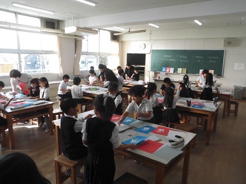図画工作の学習です。水彩絵の具を手の平につけて、画用紙にスタンプ。この手形をもとに作品をつくります。何ができるのか楽しみです。