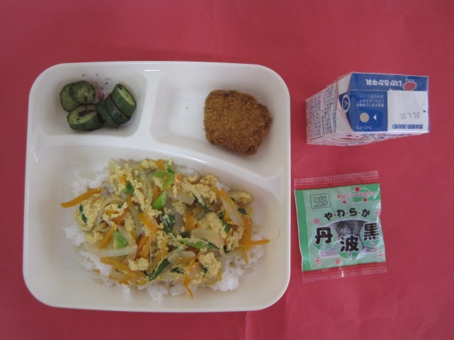 トンカツは冷凍のまま油で揚げました。たまねぎ、にんじん、青ねぎを煮て、砂糖、みりん、塩、薄口しょうゆ、濃い口しょうゆで味つけし、最後に鶏卵を流し入れた具をごはんの上にかけ、トンカツを添えたカツ丼です。卵にアレルギーのある児童は、卵を入れる前に取り分けたものを食べました。