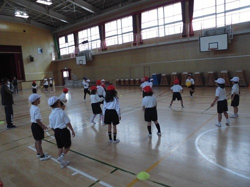 体育の「ボールゲーム」の学習で、「中あてドッジボール」をしています。みんなで楽しくねらいをさだめたり、ボールをかわしたりしていました。
