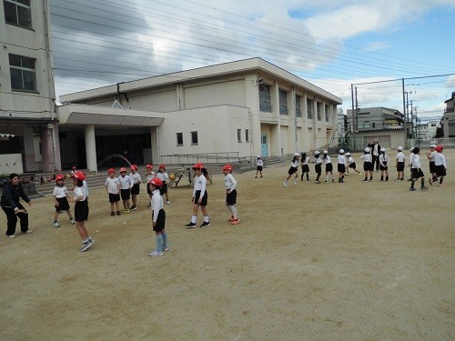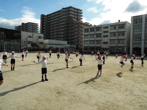 体育の学習で「なわとび大会」をしました。前跳び、後ろ跳び、かけ足跳びで、誰が一番たくさん跳べるかチャレンジしました。みんな上手に跳んでいます。最後に、みんなで大なわをして楽しみました。
