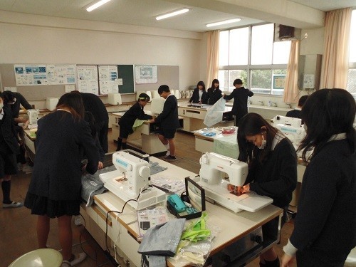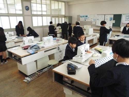 家庭科の「ミシンで楽しくソーイング」の学習で、エプロンをつくっています。生地を裁断し、ミシンで縫っています。