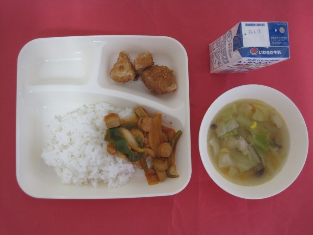 鶏肉、キャベツ、にんじん、むきえだまめ、コーン、しめじを使ったスープと冷凍のれんこんフライを油で揚げたれんこんフライです。