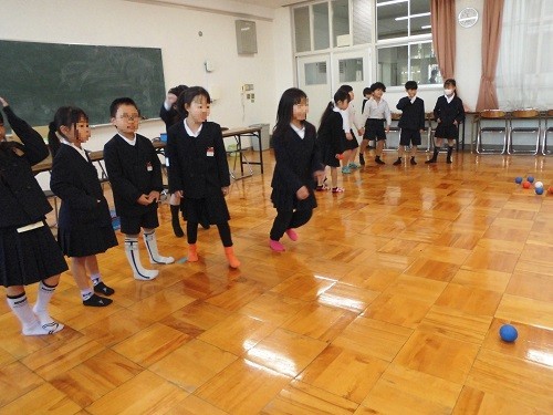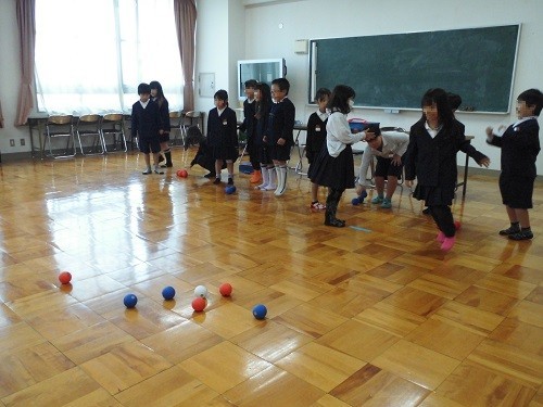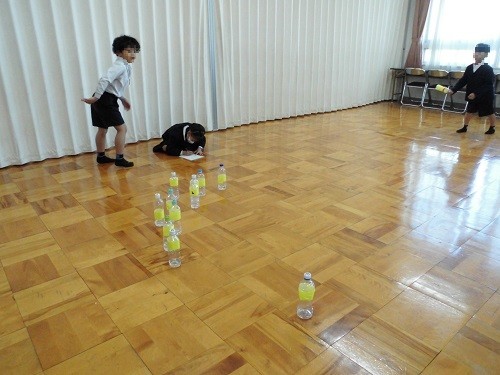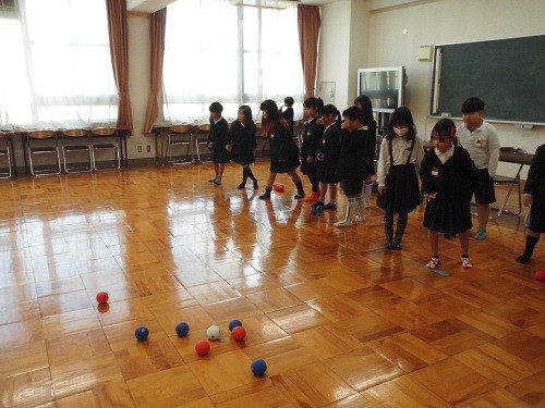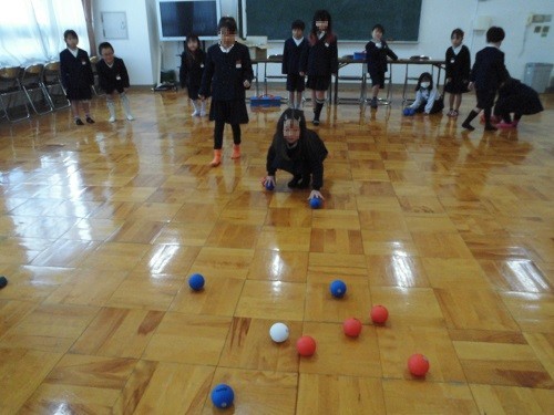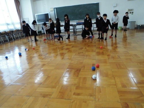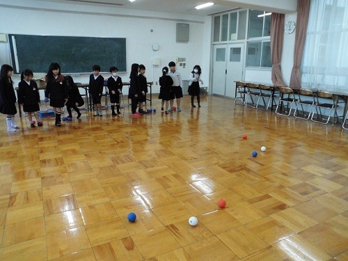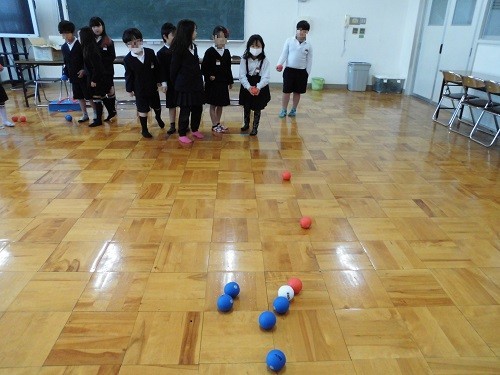 学級活動の時間に、ボッチャとモルックで遊びました、先日贈呈いただいたボッチャボールで取り組みました。初めてでしたが、ルールをよく理解して楽しんでいました。ペットボトルでモルックにもチャレンジしました。