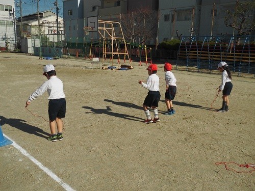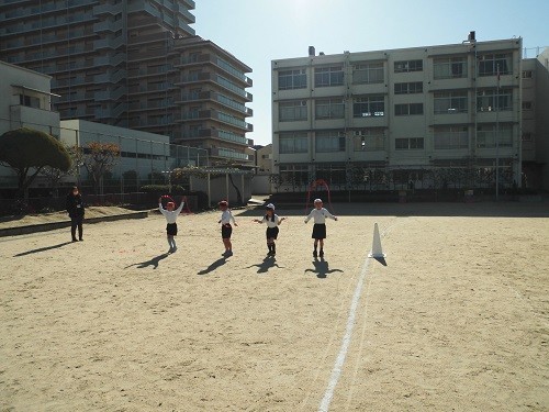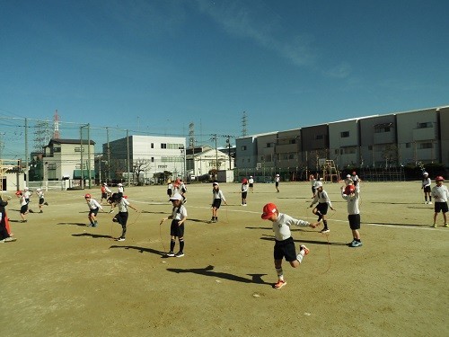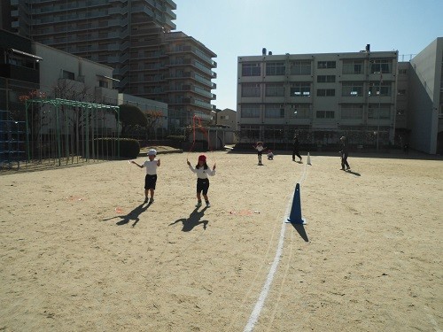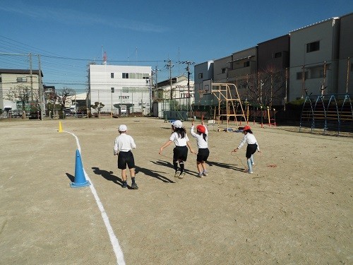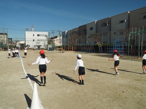 体育の学習です。なわとび大会の第3弾です。今日はなわとびリレーです。トラックを走り、コースの途中で「前跳び」、「後ろ跳び」、「かけ足跳び」をします。みんな上手に跳べるようになっています。大きな声援で盛り上がっていました。