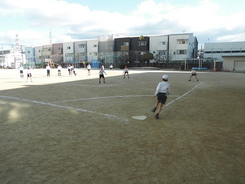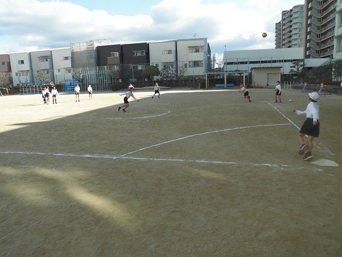 体育の「キックベースボール」の学習です。力強くボールを蹴ったり、追いかけたり、寒さに負けず頑張っています。