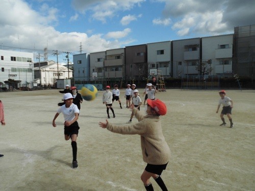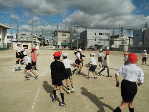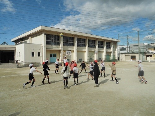 体育の「ポートボール」の学習です。チームで話し合い作戦を立て、試合をしていました。声を掛け合い、パスを回し、シュートを決めようと走り回っていました。