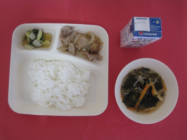 鶏肉、うすあげ、もやし、にんじん、わかめを使った五目汁と季節のきくなとはくさいを使ったおひたしです。