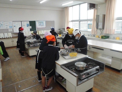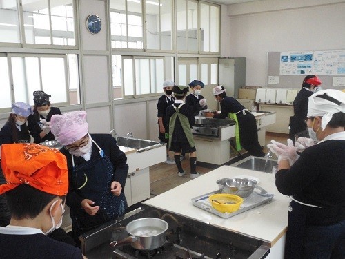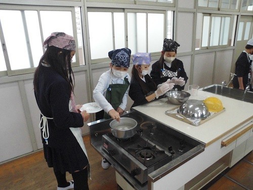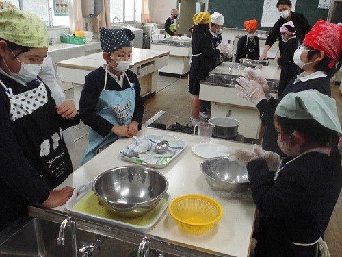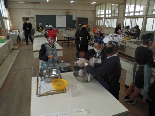 家庭科の「家族とのつながりを深めよう」の学習で、調理実習をしました。白玉団子を作りました。白玉粉をこねて丸め、ゆでて作りました。