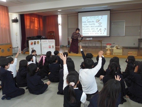 2年生は、初めに、韓国の食べ物やあいさつ、衣装について教えてもらい、「ラ・ラ・ラ」を歌ってじゃんけん(カウイ・バウイ・ボ)をしました。