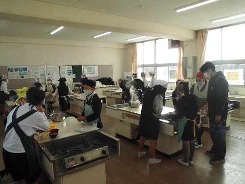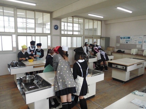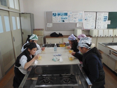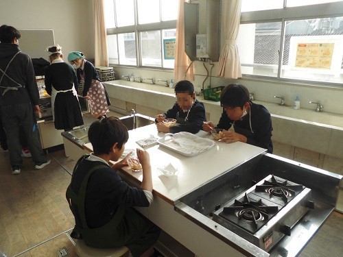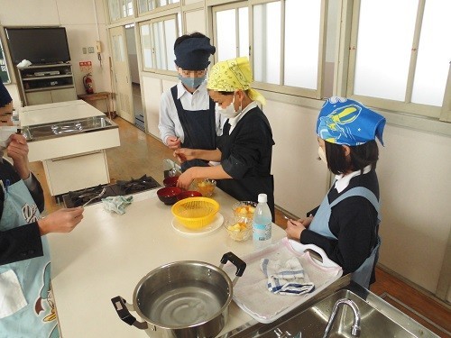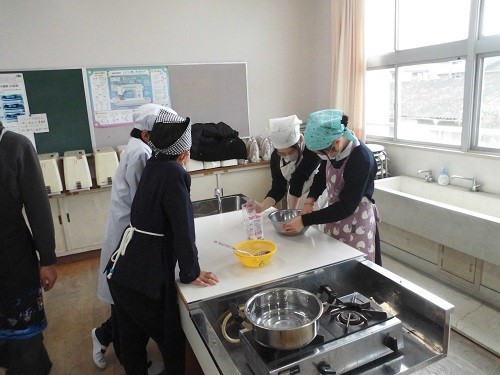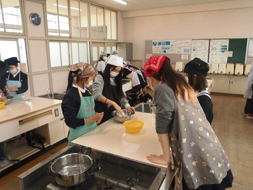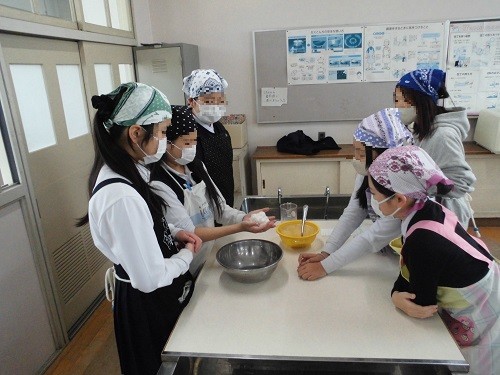 家庭科の調理実習で「白玉団子」を作りました。みんなで協力して白玉粉をこね、丸めていました。丸めた後、指でまん中をすこし押して形を整え、職人さんのようでした。最後は、フルーツ白玉やみたらし白玉、きな粉みたらし白玉にして、美味しくいただきました。