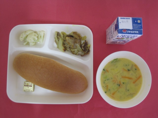 コーンペースト、はくさい、コーン、にんじん、パセリを使ったコーンスープと季節のカリフラワーを使ったピクルスです。