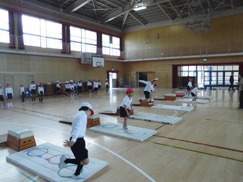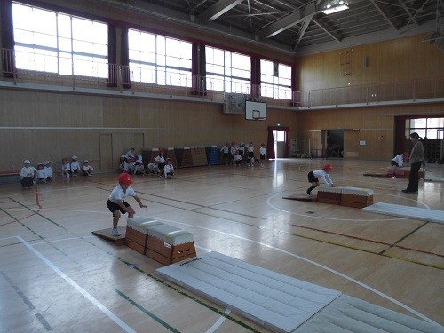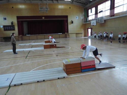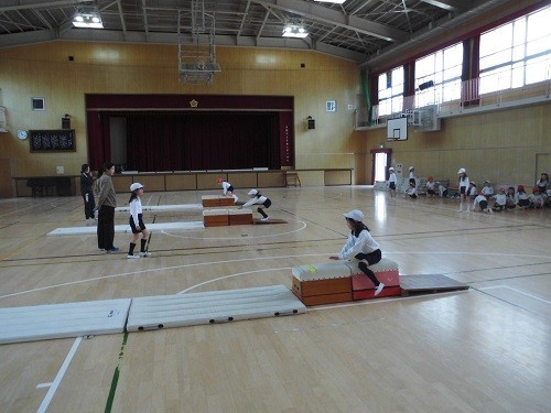 体育の「跳び箱」の学習です。着地の仕方、跳び箱への手の着き方、身体の動かし方について個別に練習しています。1つ1つの動きを覚え、跳ぶ運動につなげていきます。