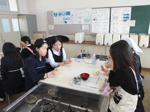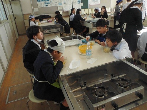 家庭科の調理実習です。白玉粉で白玉団子を作りました。みたらし団子にしたり、フルーツ白玉にしたりして美味しくいただきました。みたらしのたれの甘いいい匂いがして、お店の前を通りかかったような気分になりました。