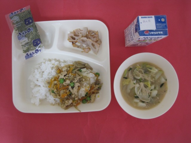 豚肉、はくさい、たまねぎ、えのきたけ、だいこん葉を使ったみそ汁と焼きれんこんです。