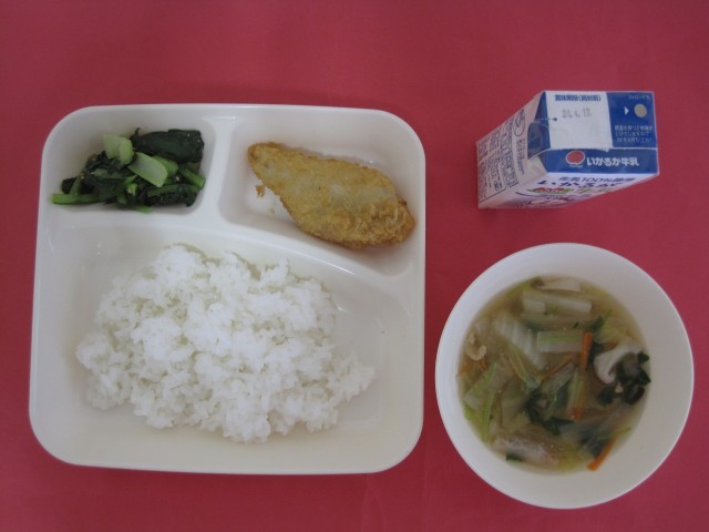 鶏肉、はくさい、だいこん、にんじん、みつば、生しいたけを使ったうすくず汁とこまつなのごまあえです。