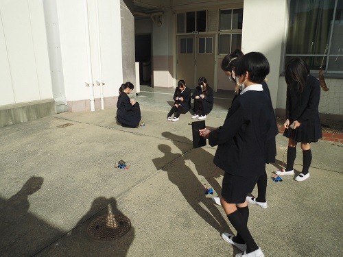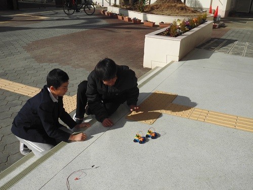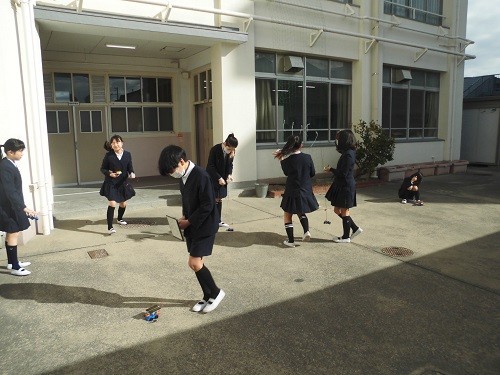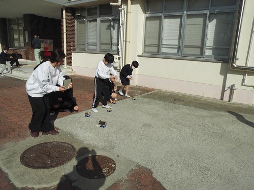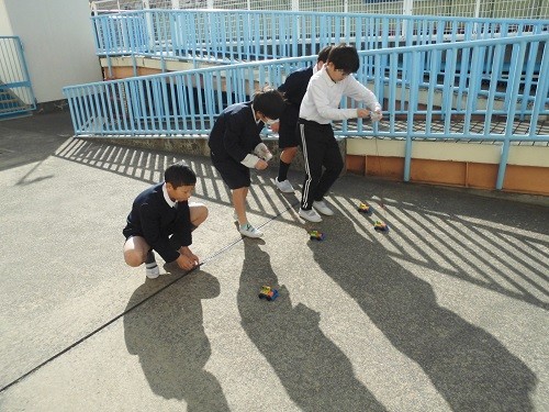 理科の「発電と電気の利用」の学習のまとめとして、実験で作った車を走らせています。手動の発電機を回したり、コンデンサーに電気をためたり、光電池を使ったりと、それぞれが確認したい方法で車を動かしていました。
