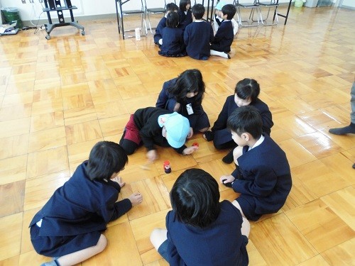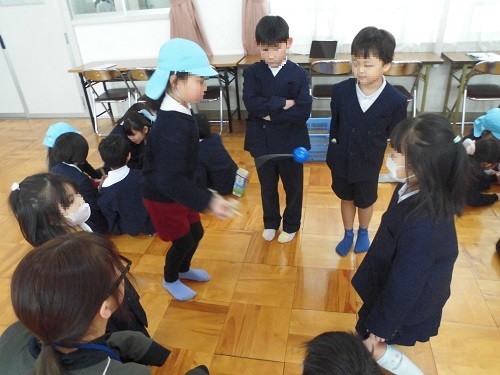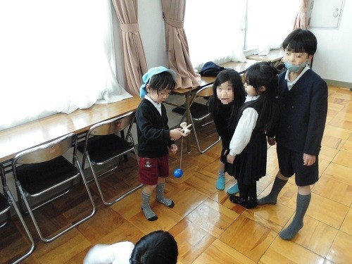 1年生が一緒に校内を案内した後、「えがおの花がさくように」を歌い、小学校の1年間の生活について説明しました。その後、だるま落としやけん玉を一緒にしました。もうすぐ2年生になる子ども達は、先輩として優しく接していました。
