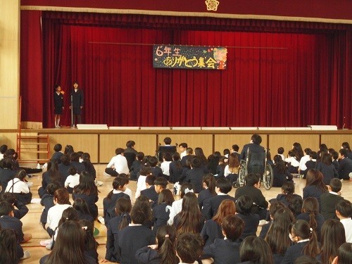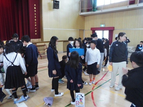 最後に、在校生から6年生に「ありがとうカード」が渡されました。これは、先日の卒業遠足の日に、5年生を中心としてふれあいタイムで作ったものです。在校生からのプレゼントに6年生は照れながらも喜んでいました。