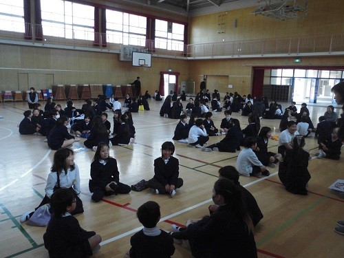 初めに、「心を合わせて~以心伝心~ゲーム」をしました。出題されたクイズの答えをふれあい班で考えます。発表時にみんなの答えがそろっていればポイントになります。初めはなかなか答えがそろいませんでしたが、だんだん答えのそろう班が増えてきました。最後の問題は、「6年生に伝えたい言葉は何でしょうか」でした。どの班も「ありがとう」と答え、講堂中に感謝の声が響きわたっていました。楽しい時間を過ごしていました。
