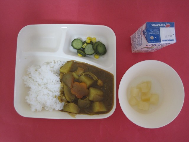 きゅうりとコーンを使ったサラダと缶詰めの洋なしです。