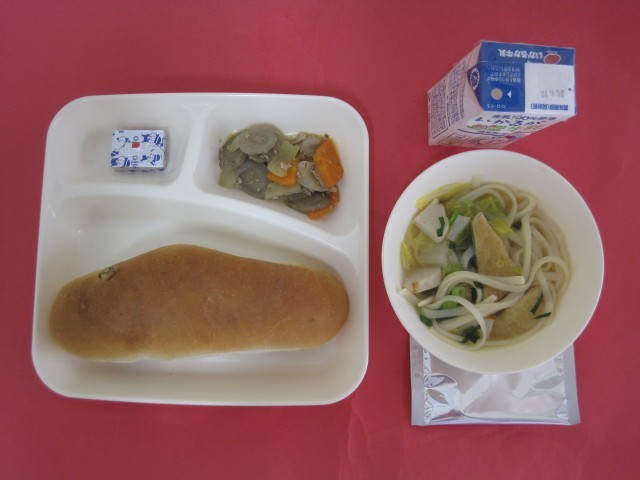 かまぼこ、うどん、三角に切ったうすあげ、はくさい、青ねぎを使ったうどんです。大阪で生まれたきつねうどんをイメージしたうどんで、大阪市の給食ではなにわうどんと命名しました。とろろこんぶを入れて食べました。それに固形チーズをつけています。