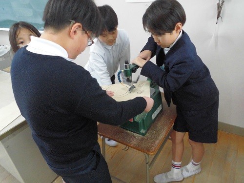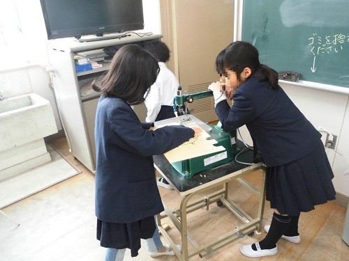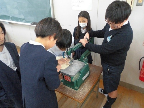 図画工作科の「糸のこスイスイ」の学習です。電動系のこぎりを使ってシナ板を切って、ホワイトボードをつくっています。安全に気を配り、友だちと気をつけてのこぎりを使っていました。