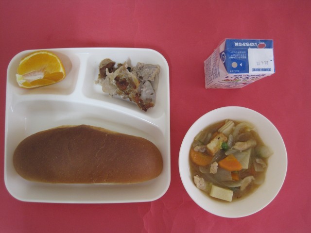 鶏肉、あつあげ、はくさい、たまねぎ、たけのこ、にんじん、さんどまめを使ったうま煮と季節のデコポンです。