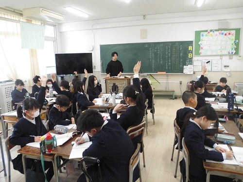 国語の「世界一美しいぼくの村」の学習です。主人公ヤモのパグマンの村に対する気持ちを考えています。グループで話し合いながらまとめています。