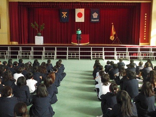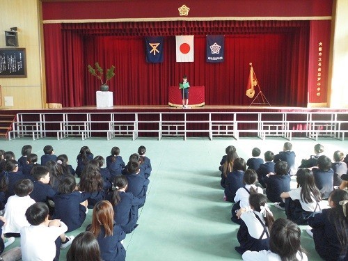 5年生が全校児童を代表して、校長先生から修了証をいただきました。校長先生のお話の後、1年生と4年生が今年の学習をふり返り発表をしました。1年生は運動会の思い出を、4年生は社会見学で訪れた「あべのタスカル」での学習について発表していました。最後にみんなで校歌を斉唱しました。