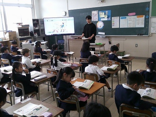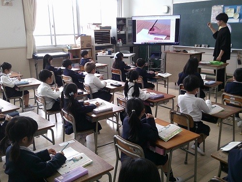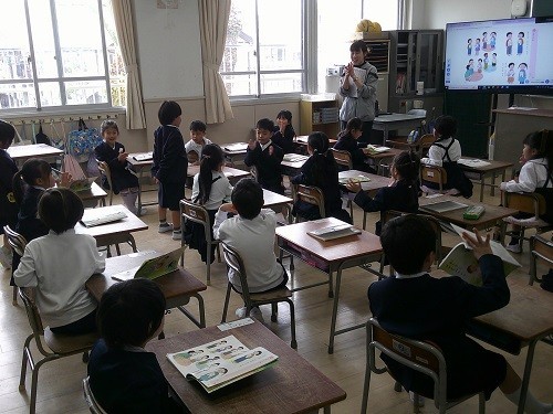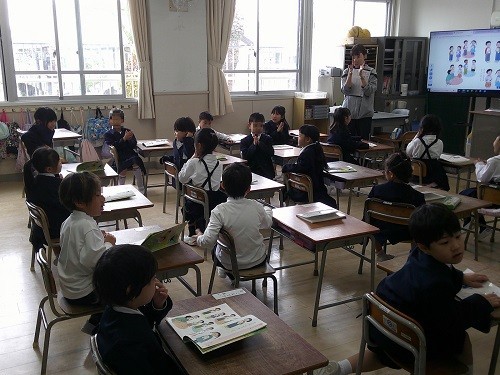国語科の学習です。「よろしくね」では、あいさつの練習をしました。「たのしくかこう」では、書きやすい姿勢、鉛筆の持ち方を学びました。