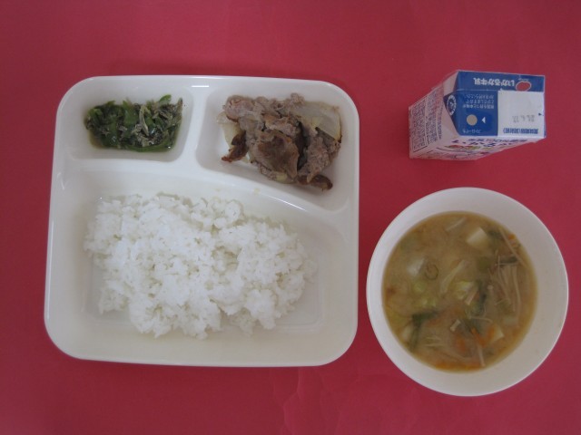 とうふ、キャベツ、にんじん、青ねぎ、えのきたけを使ったみそ汁とちりめんじゃことピーマンを炒め、砂糖、料理酒、濃口しょうゆで味つけしたじゃこピーマンです。 ピーマンが苦手な児童も、おいしいと食べていました。