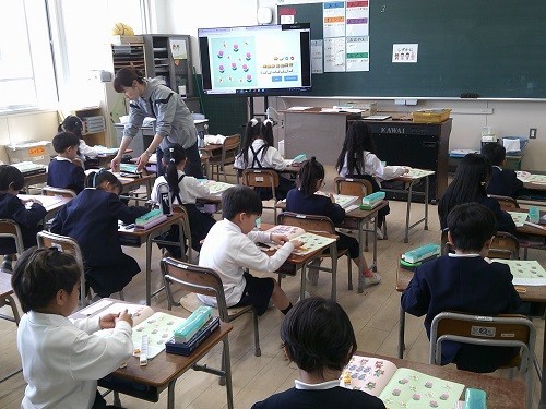算数の「なかまづくりとかず」の学習です。今日は初めて算数ブロックを使って学習しました。