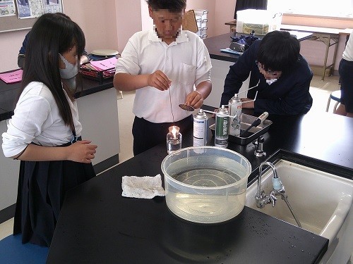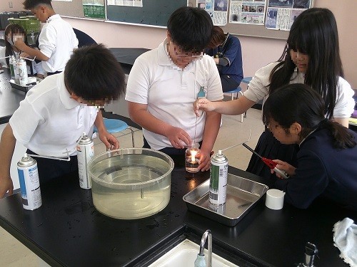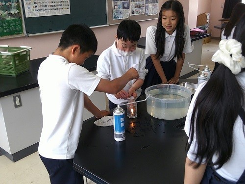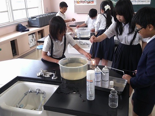 理科の「ものが燃えるしくみ」の学習です。ちっ素、酸素、二酸化炭素のものを燃やす働きを調べています。友だちと協力し安全に気をつけて実験をしていました。