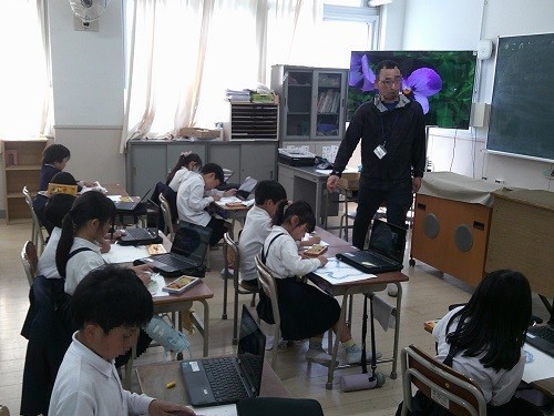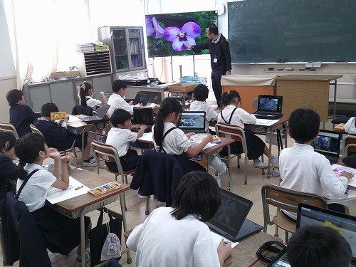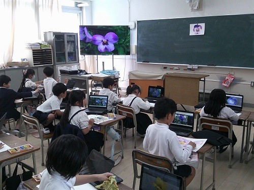 図画工作科の「きせつをかんじて」の学習です。先日タブレットで撮影した校庭の花を見てパスで描いています。色を重ねたりぼかしたりしながら、色鮮やかな花の様子を表現しています。