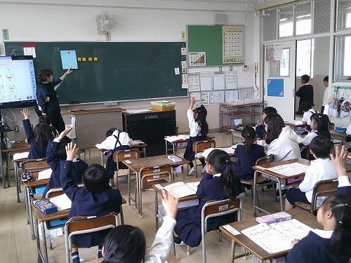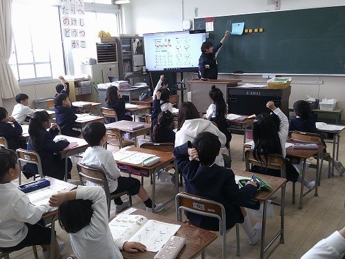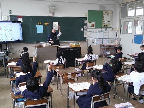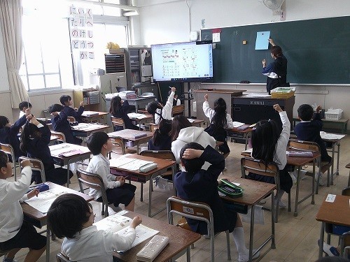 算数科で、5を分けるといくつといくつになるかという学習をしています。先生の質問に元気よく手を挙げ、発表していました。
