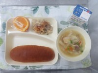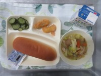 白身魚フリッター、スープ煮、きゅうりのピクルスです。今日のコッペパンには、ブルー...