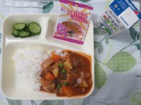ハヤシライス、きゅうりのバジル風味サラダ、いもけんぴフィッシュです。いもけんぴと...