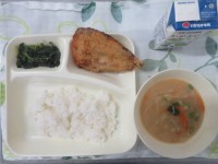 いわしフライ、みそ汁、ほうれんそうのごまあえです。いわしには、体を作るもとになる...
