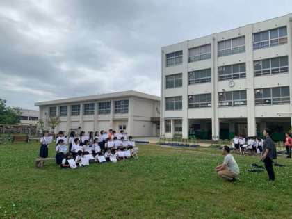50周年記念誌の学級写真を撮影しています。野原のうえで、みんないい笑顔です。
