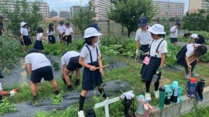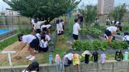 学年の畑をみんなで整えました。土にふれてみんなも楽しそうにしていました。