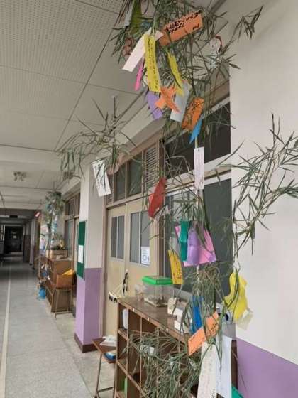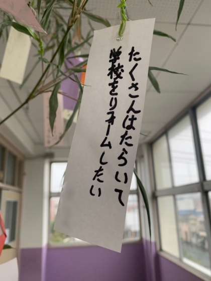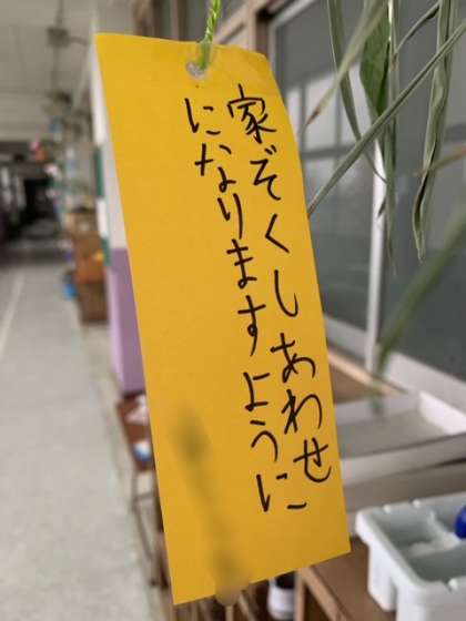 地域の方に毎年笹をいただいています。その笹に子どもたちの願い事が書かれた短冊がつけられています。1年生、3年生の教室前にあります、懇談会のときに是非ご覧ください。
