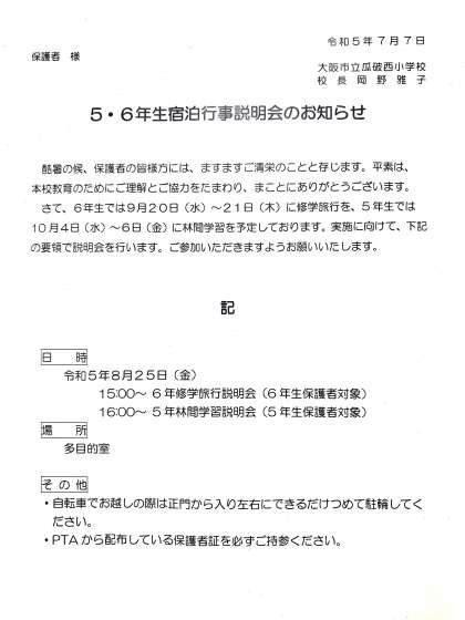56年生宿泊行事説明会のお知らせ 公開日 2023/08/24 更新日 2023/08/24 お知らせ 先日案内している通り明日25日に実施しますので、5・6年生保護者の皆様はご予定ください。 いいね(0)