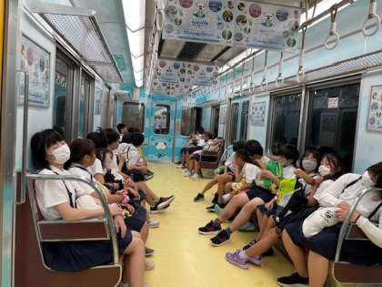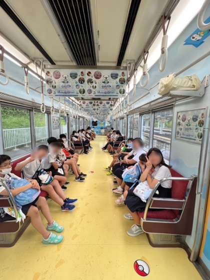 鳥羽水族館で向かう車内。ポケモンとのコラボ車両に乗っています。