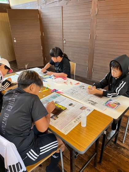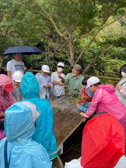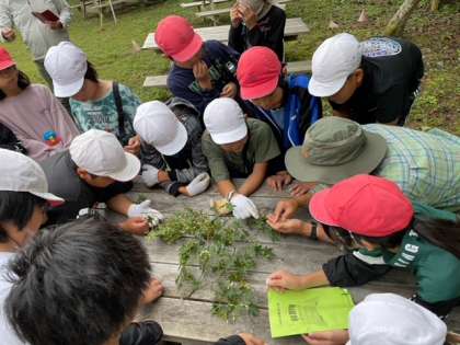 午前の活動中です。焼き板ペイント、生き物調べ、竹切り体験をチーム毎でローテーションしていきます。野外活動の専門家の方にも来ていただいて、みんな自然の中の遊びを楽しんでいます。外は少し雨がぱらついているようです。