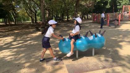 遊びの時間です。遊具で遊ぶ子や、どんぐりを探す子などみんなそれぞれたのしんでいます。