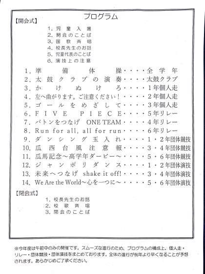 明後日29日(日)は運動会です。 公開日 2023/10/27 更新日 2023/10/27 お知らせ 開会は8時40分と早いので、集団登校に遅れないようにしてください。また、服装や持ち物の確認を余裕を持って行っていただき、当日は忘れ物がないようによろしくお願いします。 いいね(0)