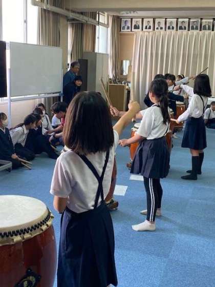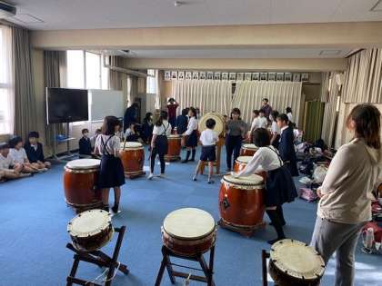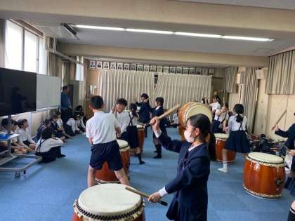 新年度になって、太鼓クラブの活動が初日を迎えました。経験のある上級生がリーダーとなり、新しく希望した4年生を前に活動開始。息のあった太鼓の音を響かせていました。