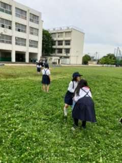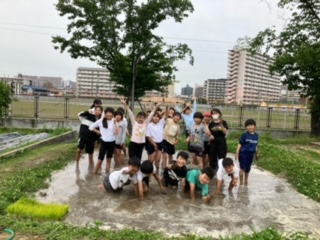 バケツリレーをして田んぼに水を入れて代かきをしました。