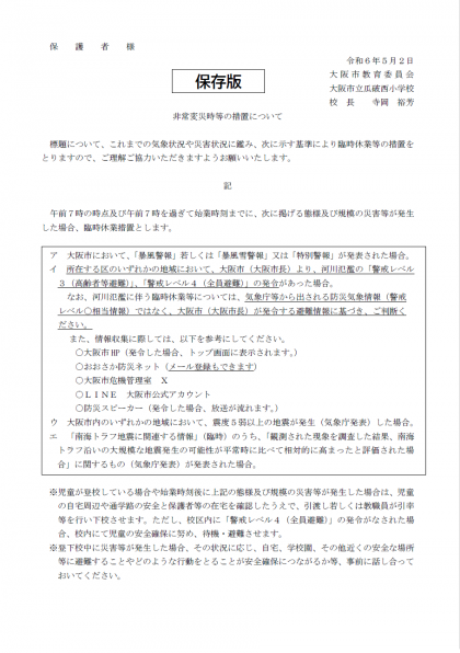本校の始業式は8月27日(火)です。この前後に大阪市に台風による暴風警報や特別警報が発表されている場合は、臨時休業や始業を遅らせたり、緊急下校の措置をとることとなります。以前にお配りした手紙を再掲載(配布文書にもあります)しますので、ご確認ください。なおミマモルメによる連絡も活用しますので、あわせてこまめにチェックしていただくとともに、スマートフォンの最初の画面にアイコンを置いたり、通知をONにするなど、情報を見逃さないよう工夫をお願いいたします。
